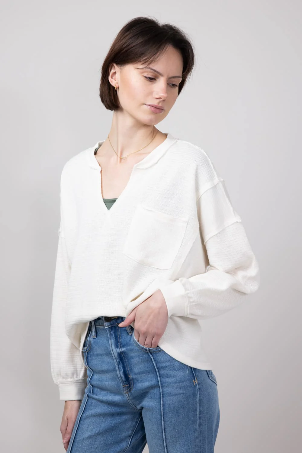 Get your hands on this Blu Pepper Notched V-neck Knit Top for Women in Oatmeal. This long sleeve shirt is going to be a go to for you. Featuring a V-neck cut, notched pattern, and a beautiful color. Check it out today!
