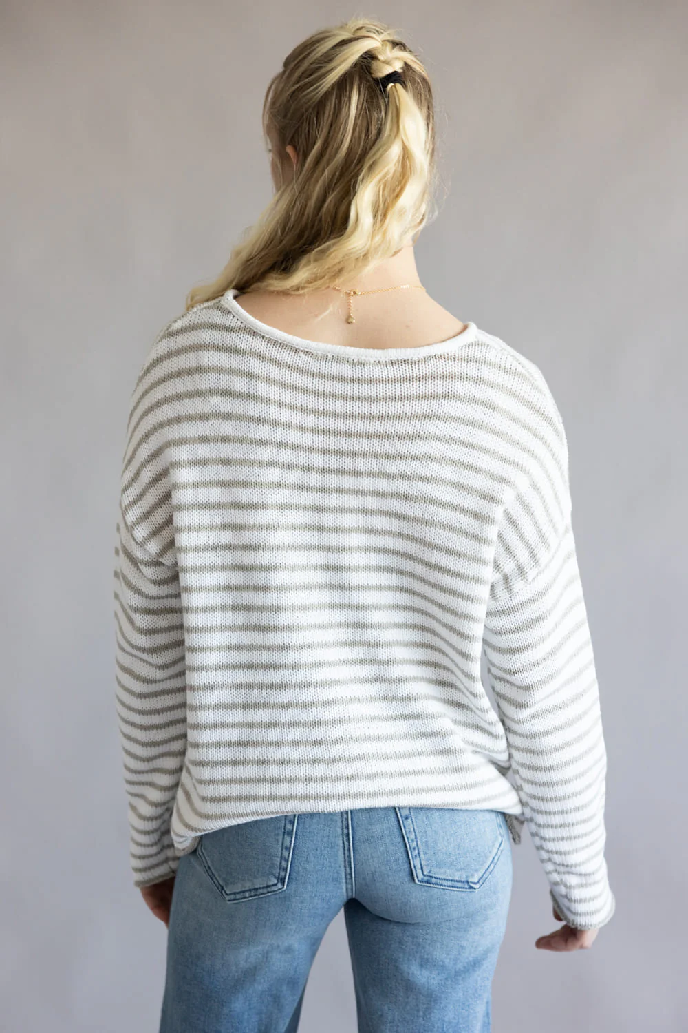 This Miracle Lightweight Gauge Stripe Sweater for Women in Ivory/Silver is perfect for your next adventure! With its long sleeves and all over stripe pattern, it will add the perfect touch of comfort and style to your next lake trip!